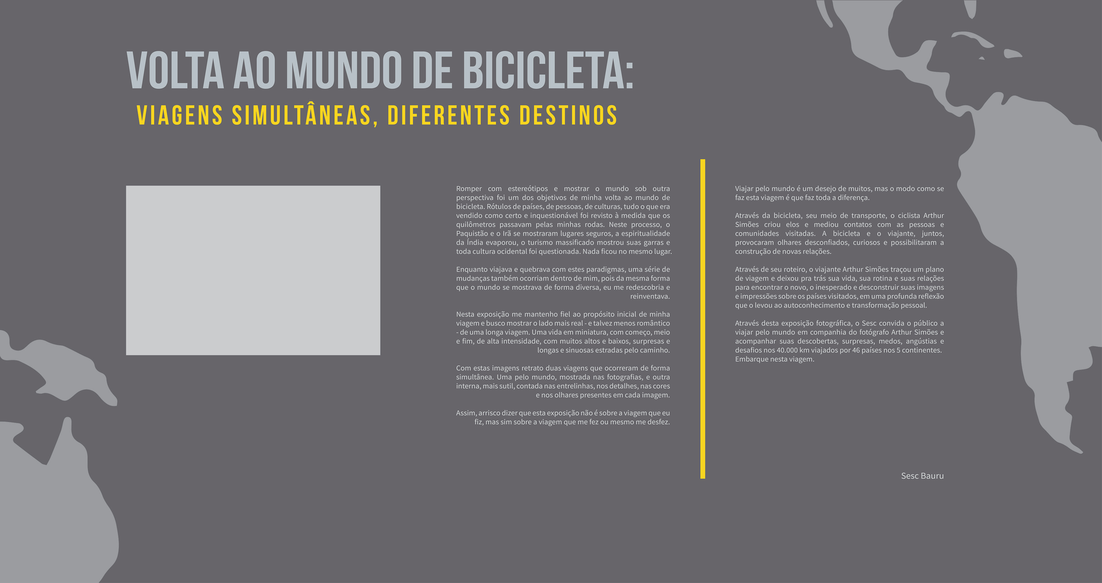 A convite da Estúdio d'Obra, que realizou a identidade, produção e montagem fina da exposição "Volta ao Mundo de Bicicleta", executamos a arte-final neste projeto para o Sesc Bauru, realizado de março a maio de 2015.